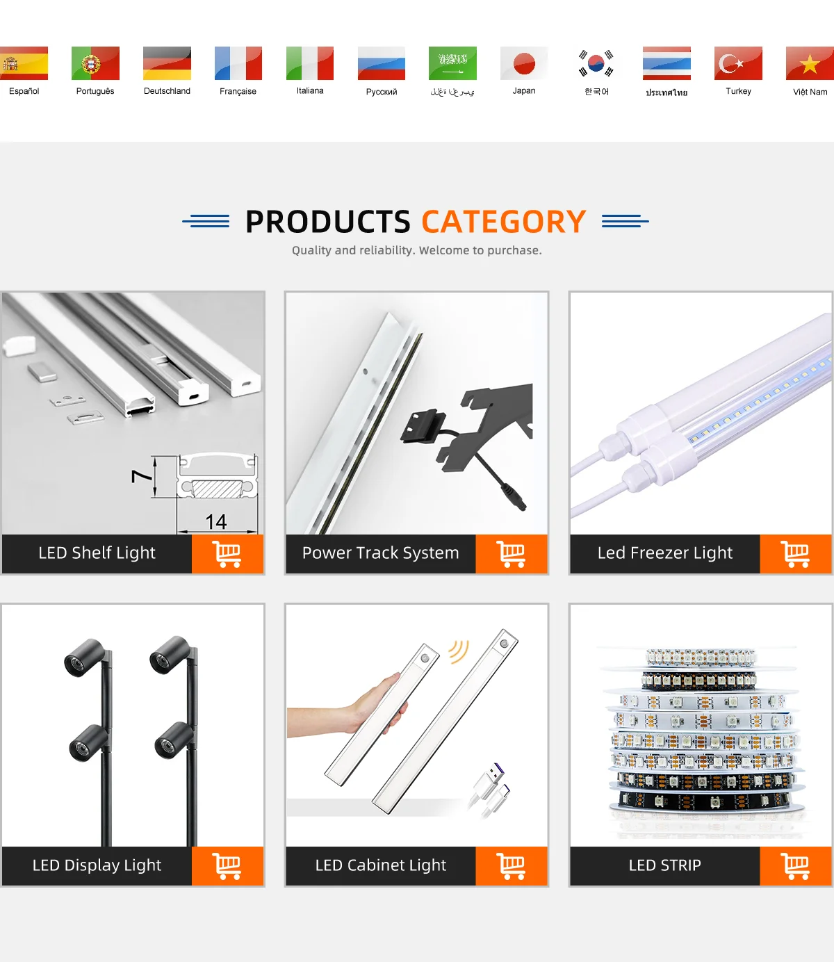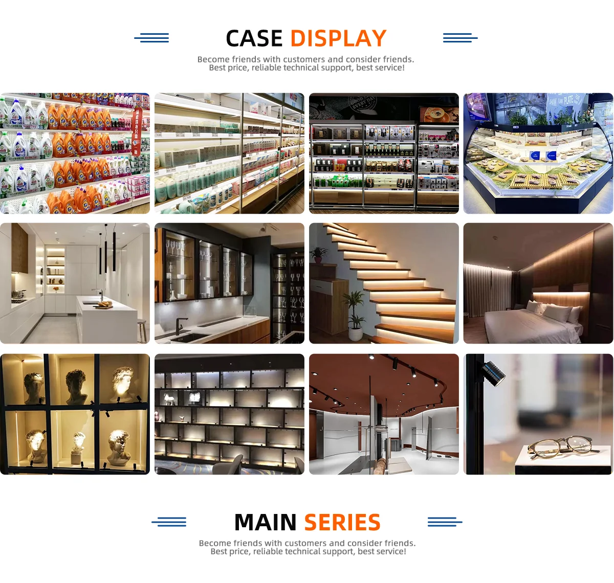 Productos principales:Luz de estante LED, luz de congelador LED, luz de gabinete LED, luz de pantalla LED, tira de luz LED